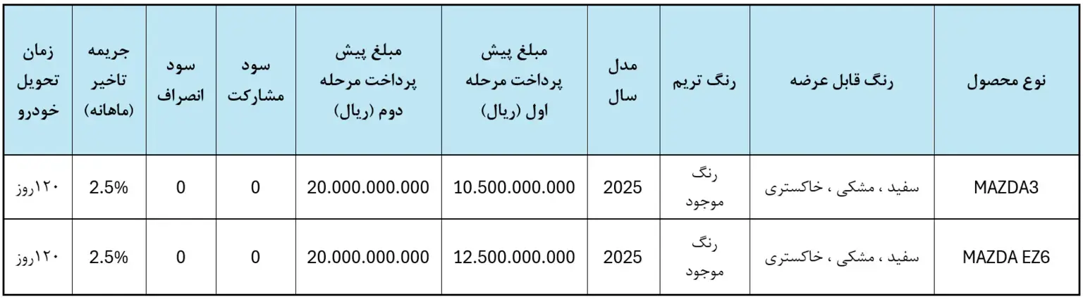 احتراما به اطلاع میرساند امکان واریز وجه مرحله دوم مبلغ علی الحساب مشتریان سامانه یکپارچه عرضه خودروهای وارداتی (MAZDA3 , MAZDA EZ6) بصورت فروش نقدی مرحله ای با قیمت غیر قطعی فراهم میباشد.
